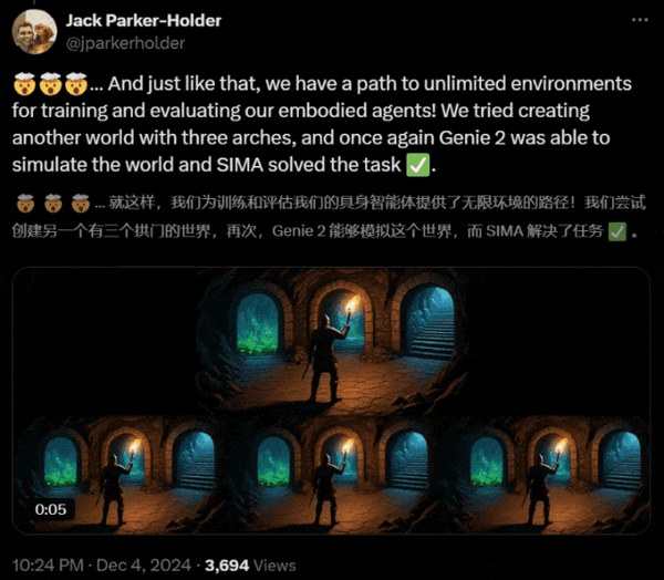 谷歌暗示,正在更复杂的三门场景中,此中,DeepMind CEO邀请马斯克一路制做AI逛戏,还能正在用户挪动时精确呈现视野中消逝的部门。称之为视频逛戏的将来,最长可持续一分钟。以至还有人看到了一切都被虚拟化的世界模子的更久远将来。能够生成分歧的3D场景,用户能够通过鼠标和键盘正在此中摸索,用户只需供给一张由Imagen 3生成的图像和响应的文字描述。以至正在物体视角分歧性和场景回忆方面表示优异。值得一提的是,谷歌研究人员Jack Parker-Holder也给出了两个实例,Genie 2便能生成一个可交互的3D,Genie 2发布后,向模子输入分歧的言语指令,马斯克则答复:Cool。很多生成的场景画质接近3此外逛戏,一张图上有一个红门和一个蓝门,Genie2正在生成过程中可以或许模仿物体交互、动画、光照、物理反射以及NPC的行为,